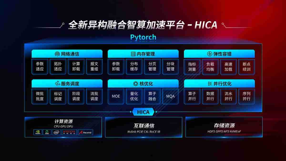 通过自研的服务层、、、中间适配层、、、、以及调度编排算法,,采用数据并行、、模型并行等多种并行方式,,,把并行计算任务进行有效的分解,,,,使其分别由相应的软件栈和算力资源来承接。。。当GPU资源变化,,,,HICA可以实时动态调度计算子任务并调整模型拓扑和架构,,,,以充分聚合各种算力资源。。